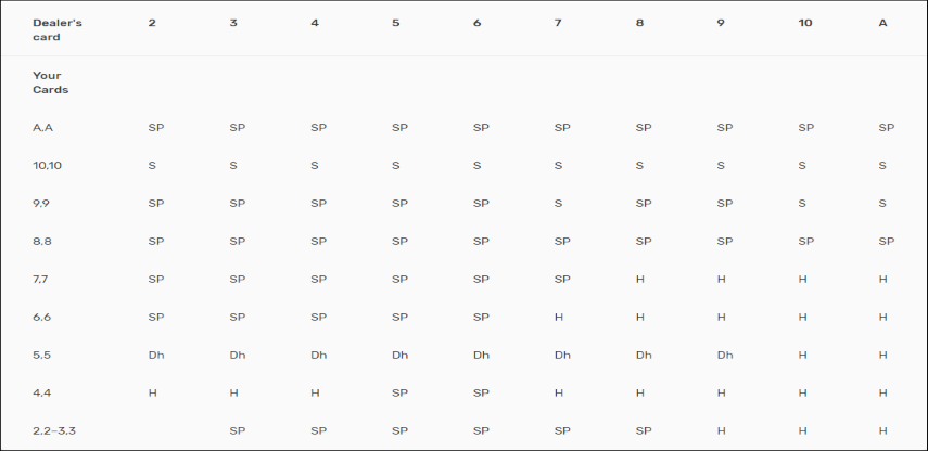 新しいタブを開き、オンラインのブラック ジャックゲームを開始し、これらの3つのチャートをグリッドとして使用して、想定される手札に応じて最適なプレイ方法を見出しましょう。