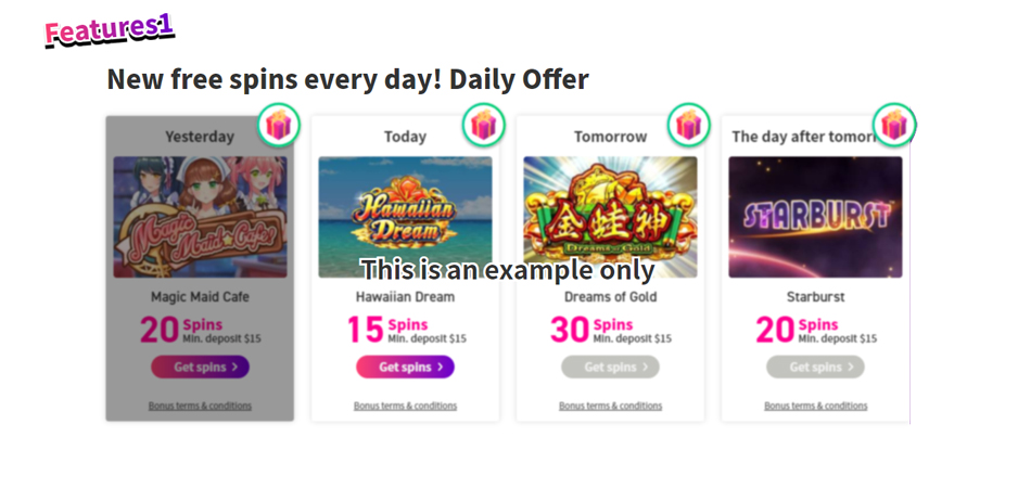 提供されているのはウェルカムボーナスだけではありません。フリースピンや入金ボーナスなどの数多くの他のカジノプロモーションも幅広く提供されています。入金フリースピン-デイリーオファーの事を耳にした事がありますか?mystino.comの利用者のアカウントでは、一連のフリースピンが毎日提供されています。すべき事は、各々のデイリーオファーに記載されている金額をウェイジャーする事だけです。つまり、Mystinoのデイリーボーナスが「入金10$で10回のフリースピン」といったものである場合、10$の入金をすれば10回のフリースピンをゲットできるという事です。