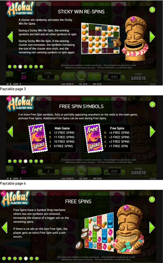 ALOHA!CLUSTER PAYSTM(アロハ!クラスターペイズ™)のRTPは96.42%で、その大半はフリースピンから獲得されています。高額賞金を獲得するには、追加のスピンをプレーできるフリースピンを利用する必要があります。フリースピンをプレーすればするほど、高額の賞金を獲得できるチャンスが更に向上します。leo vegasでは、このゲームを練習できるだけでなく、リアルマネーでプレーする事もできます。