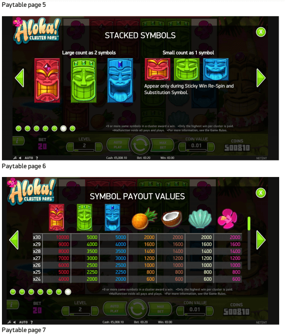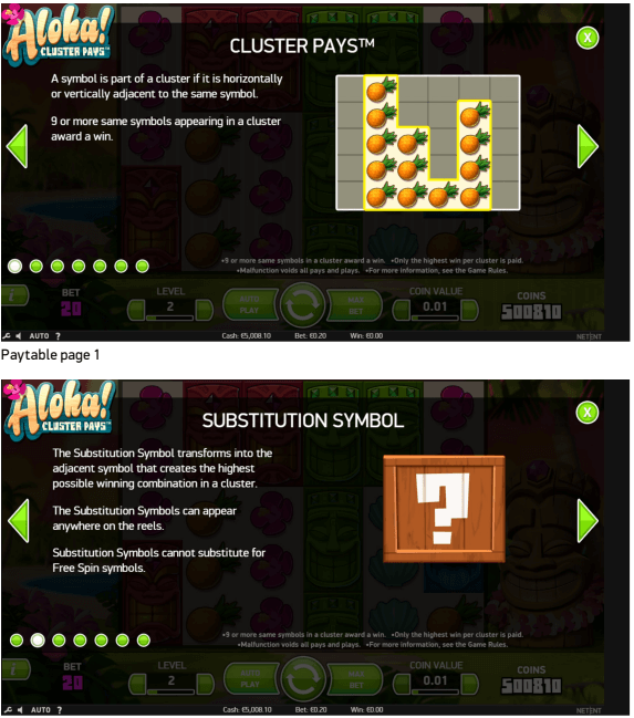 それぞれのシンボルに関する詳細は、包括的な2ページのペイテーブルから参照できます。ペイテーブルは情報ボタンをクリックすると表示させる事ができます。ゲームに戻るには、ゲームに戻るの矢印をクリックしてください。